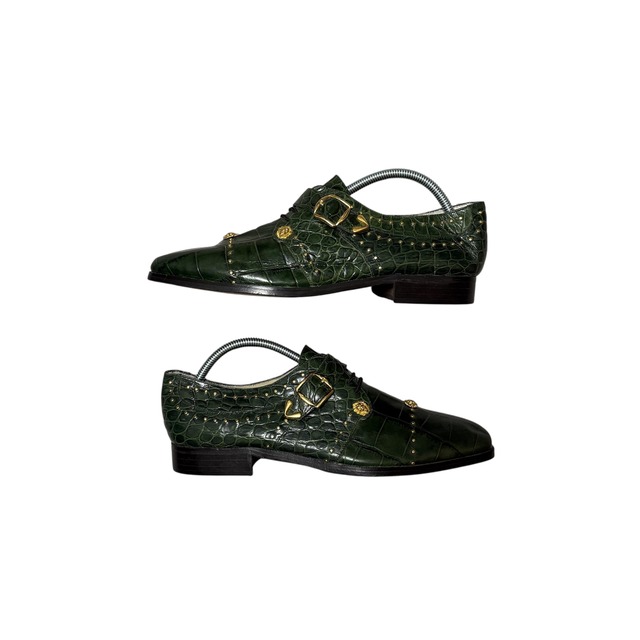 ●size 表記 : 9 1/2 着用感 : 25.5cm~26.5cm相当 全長 : 29cm ヒール : 2.5cm ●color dark green ●fabric crocodile leather ●condition S S:デッドストックや、使用感が極めて少ない状態。 A:若干の使用感はあるが、状態の良いUSED。 B:使用感はあるが、目立つ傷や大きな汚れはない。 C:部分的に目立つ傷や汚れ、使用感がある状態。 90s studs Loafer